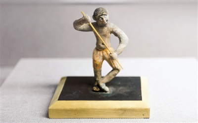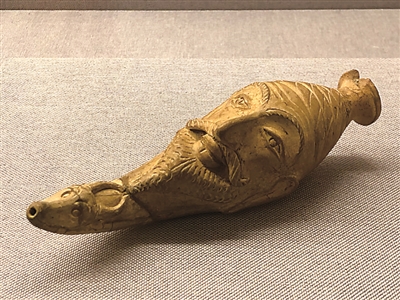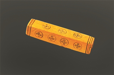 展品中的骨博具則與另一座城有關(guān)。骨博具是中原地區(qū)文化娛樂生活中常見的器具,類似今天的骰子。展出的這件骨博具出土于新疆卓爾庫特古城晚期地層魏晉十六國時(shí)期的房址中。以大型動(dòng)物骨骼磨制而成,長方形,中空,兩端各刻三道橫槽,中間分別刻1至4個(gè)圓圈,每個(gè)圓圈中間有4個(gè)小圓,小圓中心帶孔,古樸精致。