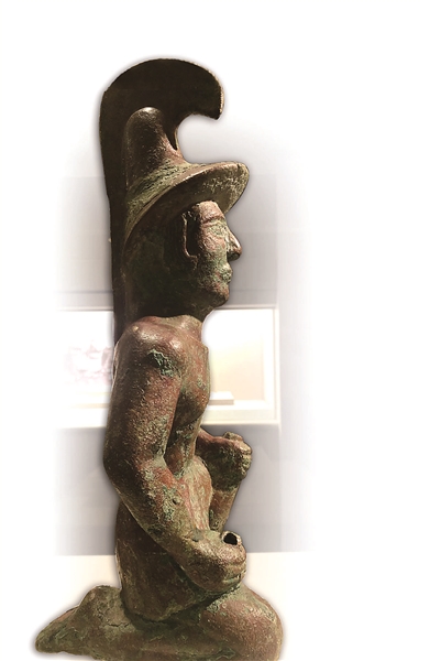 走進(jìn)展廳,首先看到的展品是戰(zhàn)國時(shí)期銅武士像,于1983年出土于伊犁哈薩克自治州新源縣鞏乃斯河南岸的墓葬中。武士上身直挺,頭戴希臘式武士盔,盔上高高凸起長盔纓,目光堅(jiān)毅嚴(yán)肅,下身半跪,雙拳緊握,原來應(yīng)握有器物,披甲帶器,像是正在接受命令安排,即將奔赴戰(zhàn)場。銅武士像旁邊是出土于同一地點(diǎn)的翼獸銅環(huán),環(huán)體中空,環(huán)圈前部有小亞細(xì)亞、西亞等地流行的高浮雕翼獸,可能為祭祀之用。配合著展廳左壁懸掛的新疆風(fēng)景圖畫,斑駁的青銅講述著它們于這片蒼茫天地間的過往,他們?cè)炀毜罔T造青銅,舉行盛大隆重的祭祀,武士們?yōu)椴柯涠鴳?zhàn),曾與希臘化世界有著深入的交往。