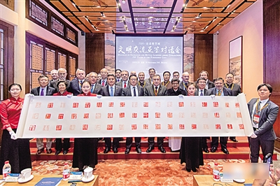 圖為閉幕式上,與會嘉賓展示書法版《文明交流互鑒對話會北京宣言》。藺紫鷗供圖