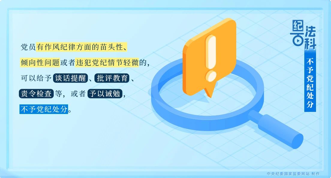 《中國共產(chǎn)黨紀(jì)律處分條例》第十九條第二款規(guī)定:黨員有作風(fēng)紀(jì)律方面的苗頭性、傾向性問題或者違犯黨紀(jì)情節(jié)輕微的,可以給予談話提醒、批評教育、責(zé)令檢查等,或者予以誡勉,不予黨紀(jì)處分!